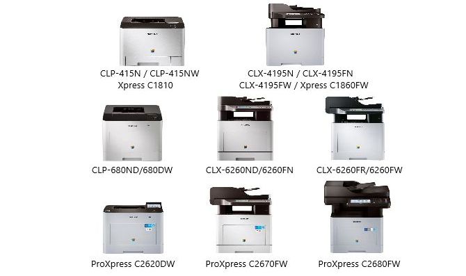 CLP-415N, CLP-415NW, CLP-680ND, CLP-680DW, CLX-4195N, CLX-4195FN, CLX-4195FW, CLX-6260ND, CLX-6260FD, CLX-6260FW, CLX-6260FR, Xpress C1810W, Xpress C1860FW, ProXpress C2620DW, ProXpress C2670FW, ProXpress C2680FX,